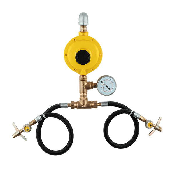 O Kit Central de Gás 2 P13 com Regulador Aliança Amarelo 12Kg/h e manômetro WIKA combina robustez e alta performance. Inclui cotovelo galvanizado, niple e tee de latão, válvula de retenção e chicotes flexíveis, garantindo segurança, durabilidade e fornecimento contínuo de GLP.