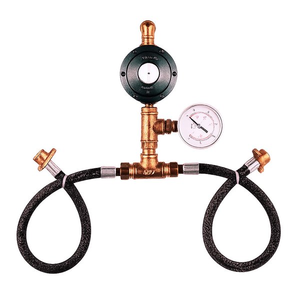 - Itens do kit: 1× Cotovelo ALMG 1/2" NPT M × 3/8" NPT F — cód. 902; 1× Regulador Aliança 506/03 7 kg/h 1/8" (azul) — cód. 965; 1× Niple redutor ALMG 1/2" NPT M × 1/8" NPT M — cód. 0098; 2× Tê mult latão 1/2" NPT F — cód. 491; 1× Bucha ALMG 1/2" NPT M × 1/4" NPT F — cód. 1099; 1× Manômetro Wika 1/4" 0–7 kgf/cm² — cód. 1048; 1× Niple ALMG 1/2" NPT — cód. 0103; 2× Válvula de retenção ALMG 1/2" NPT × 7/16" — cód. 872; 2× Chicote Liquigás 500 mm — cód. 862.