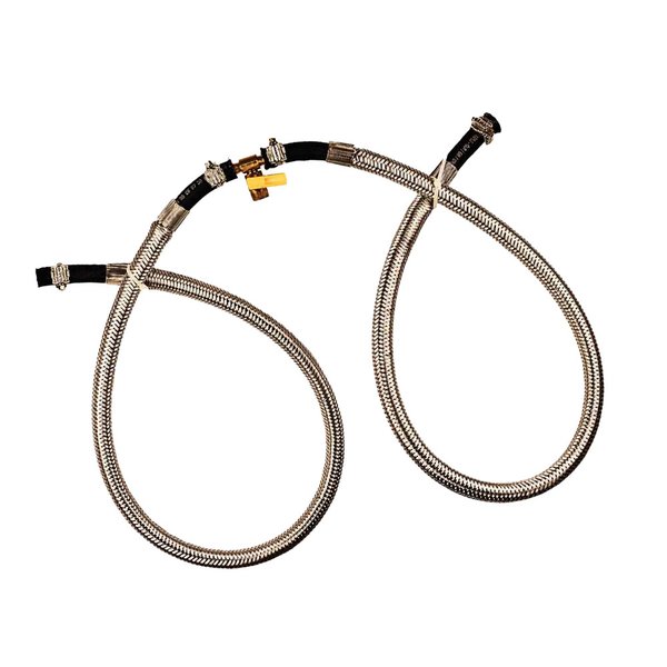 - Material da mangueira: borracha sintética (nitrílica) com reforço têxtil e malha de aço trançada