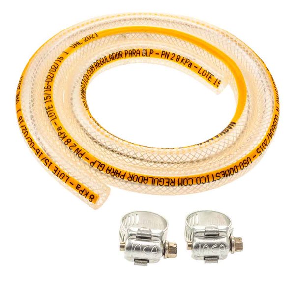 - Itens do kit: 1× Mangueira amarela normatizada 1,20 m (NBR 8613); 2× Abraçadeira INCA 13 × 19 mm — ref. 100010093AM