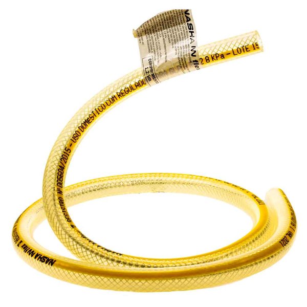 Com tarja amarela de fácil identificação, essa mangueira é certificada pelo INMETRO e atende à NBR 8613. Com estrutura trançada em fios de poliéster, suporta 2,8 kPa e temperaturas entre +5ºC e +55ºC, garantindo segurança contínua.
