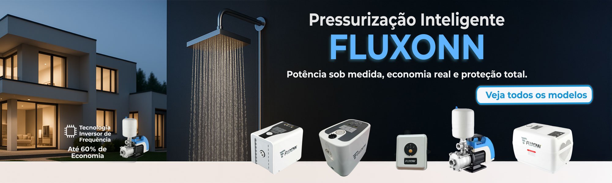Os pressurizadores inteligentes FLUXONN foram projetados para quem busca pressão constante, economia de energia e operação silenciosa em sistemas de água. Com inversor de frequência e motor de ímã permanente, eles atendem desde apartamentos compactos até residências de alto padrão e aplicações comerciais.
